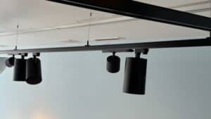 Zum Einsatz kamen hochwertige Audiokomponenten von Ecler. Die Systeme gewährleisten saubere Sprachverständlichkeit, präzise Musikwiedergabe und stabile Performance im Dauerbetrieb. Ergänzt wurde das Konzept durch eine flexible Stromschienenbeleuchtung mit dimmbaren Spots (App gesteuert), die sich je nach Tageszeit und Event flexibel anpassen lässt.